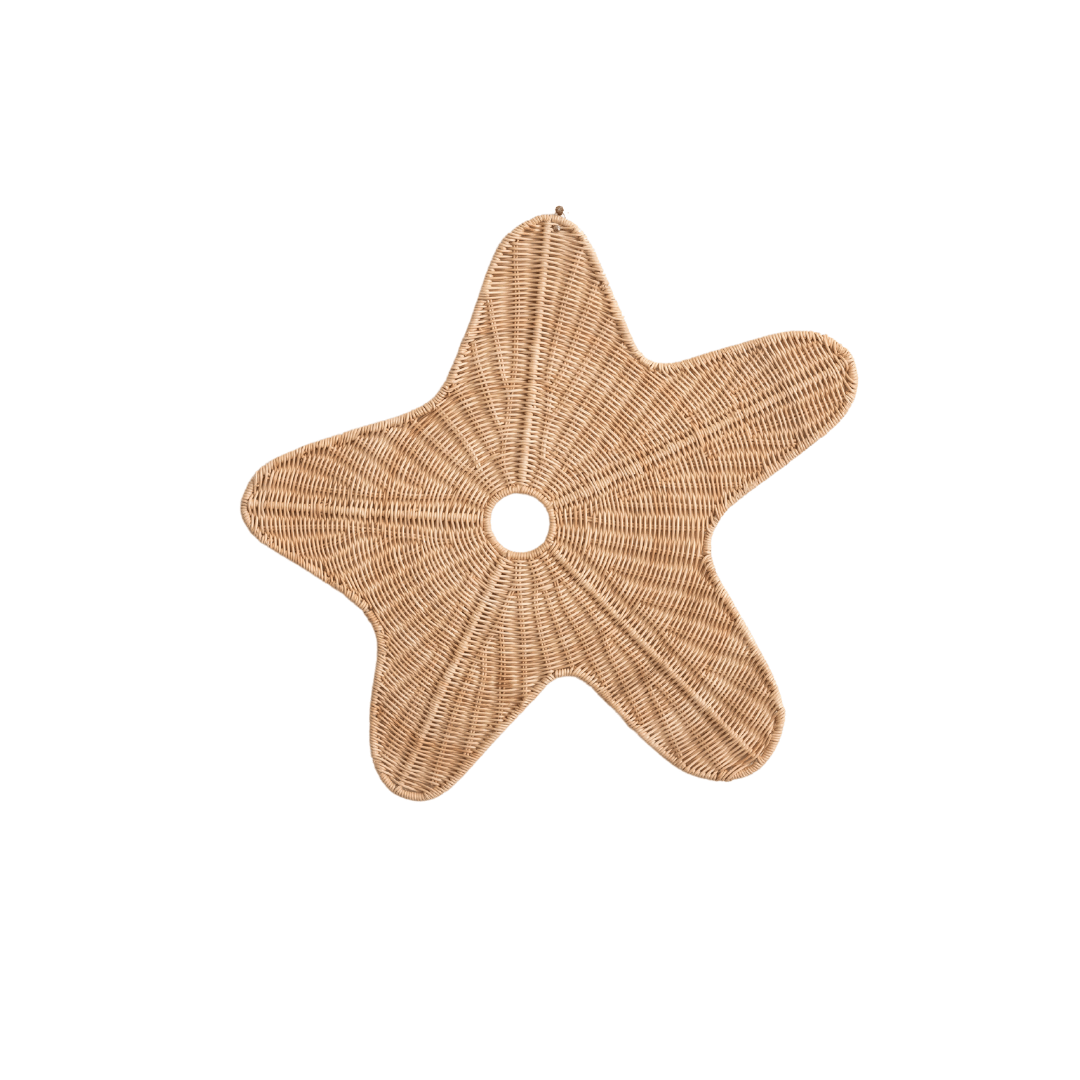 Aster de Zeester wanddecoratie , verkrijgbaar in 2 maten, handgemaakt van hoogwaardige rotan, combineert op speelse wijze een onder water thema met de natuurlijke charme van handgeweven materialen. Het design toont een speelse, vorm van een zeester.