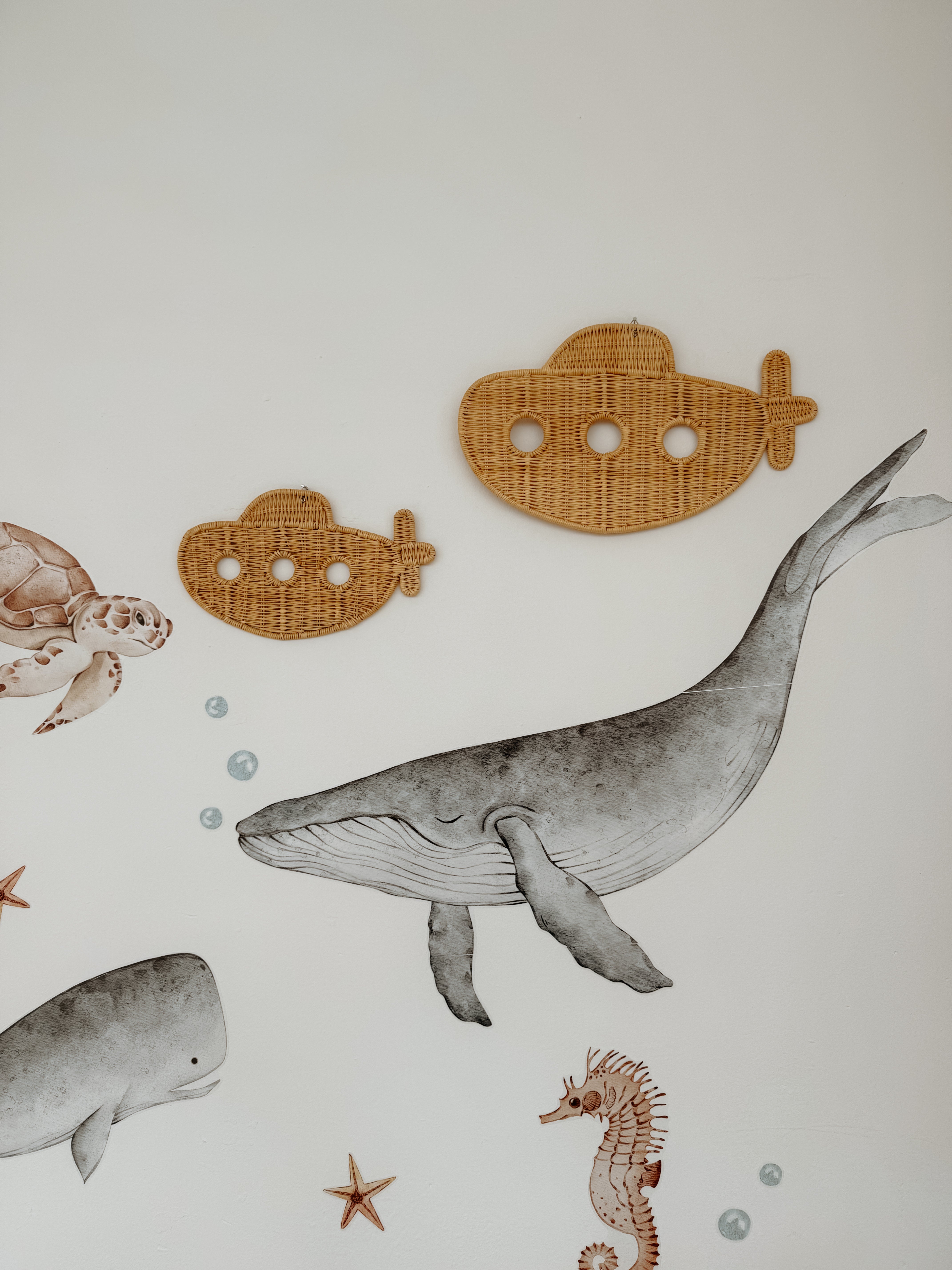 Dobby de duikboot wanddecoratie, verkrijgbaar in 2 maten, handgemaakt van hoogwaardige rotan, combineert op speelse wijze een onder water thema met de natuurlijke charme van handgeweven materialen. Het design toont een speelse, duikboot vorm.