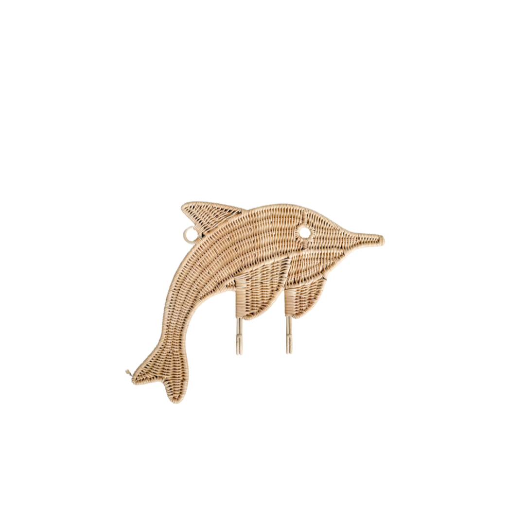 Flip de dolfijn wandhaak, verkrijgbaar in 2 maten, handgemaakt van hoogwaardige rotan, combineert op speelse wijze een onder water thema met de natuurlijke charme van handgeweven materialen. Het design toont een speelse, sierlijke dolfijn vorm.