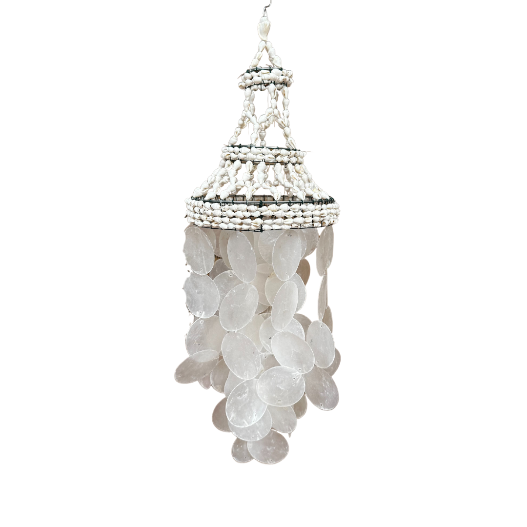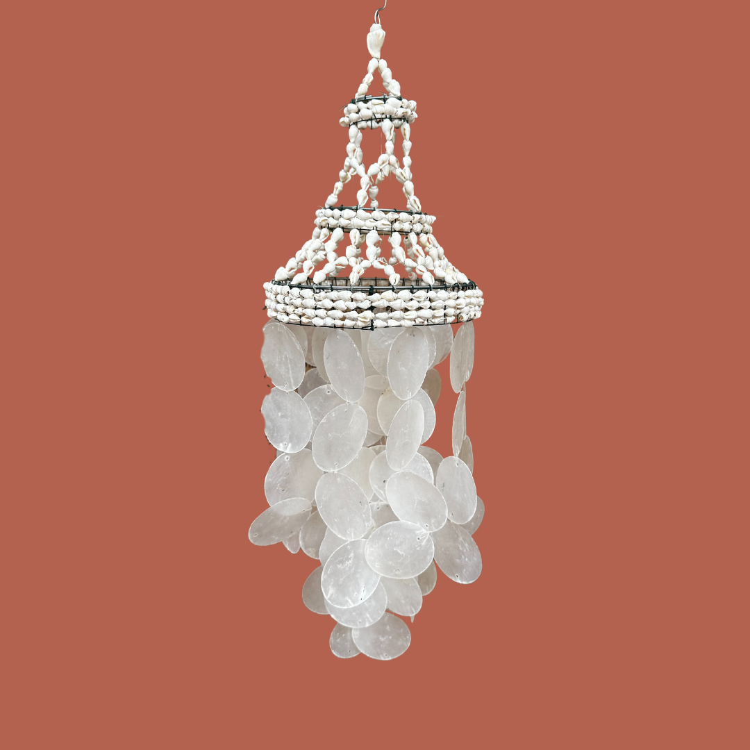 De Amara lampenkap staat ontzettend leuk boven de wieg of het ledikant, maar kan ook aan het plafond gehangen worden. Voor de handige Henriettes onder ons, kan je een lichtsnoer met bulb bevestigen en er een luster van maken. De kap is gemaakt van leuke kleine, witte schelpjes, eronder vind je schelpen in de vorm van ronde volle maantjes.