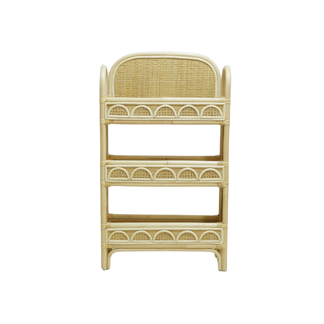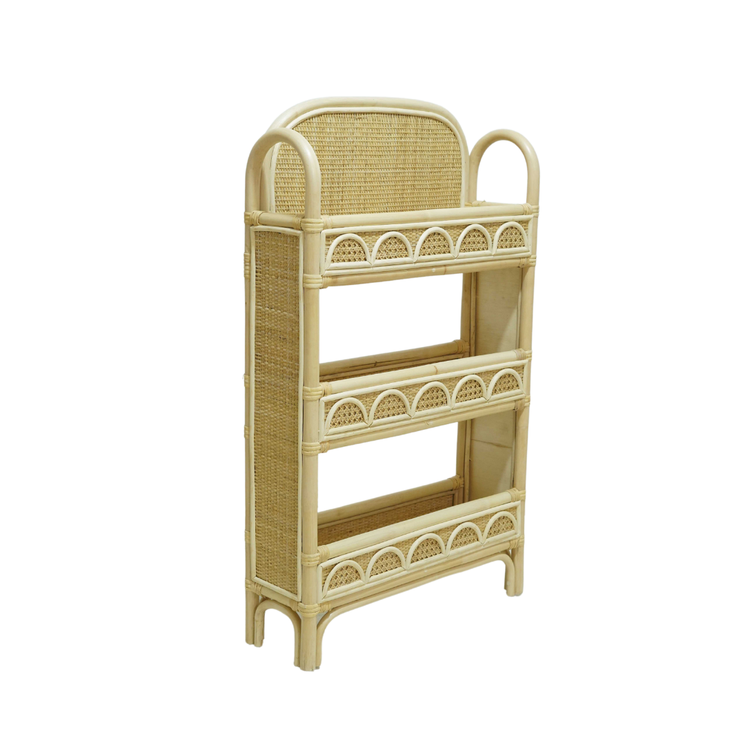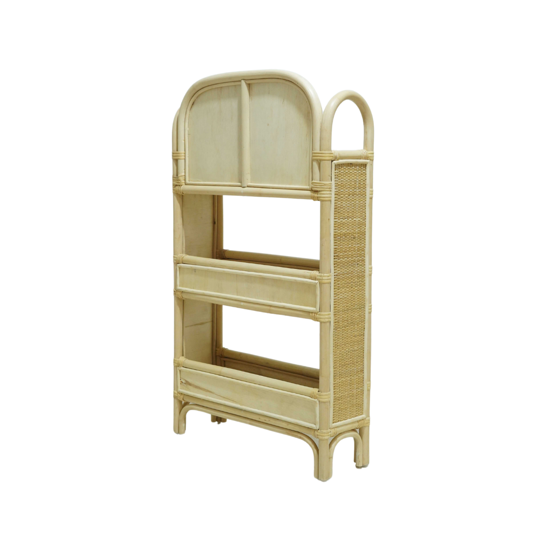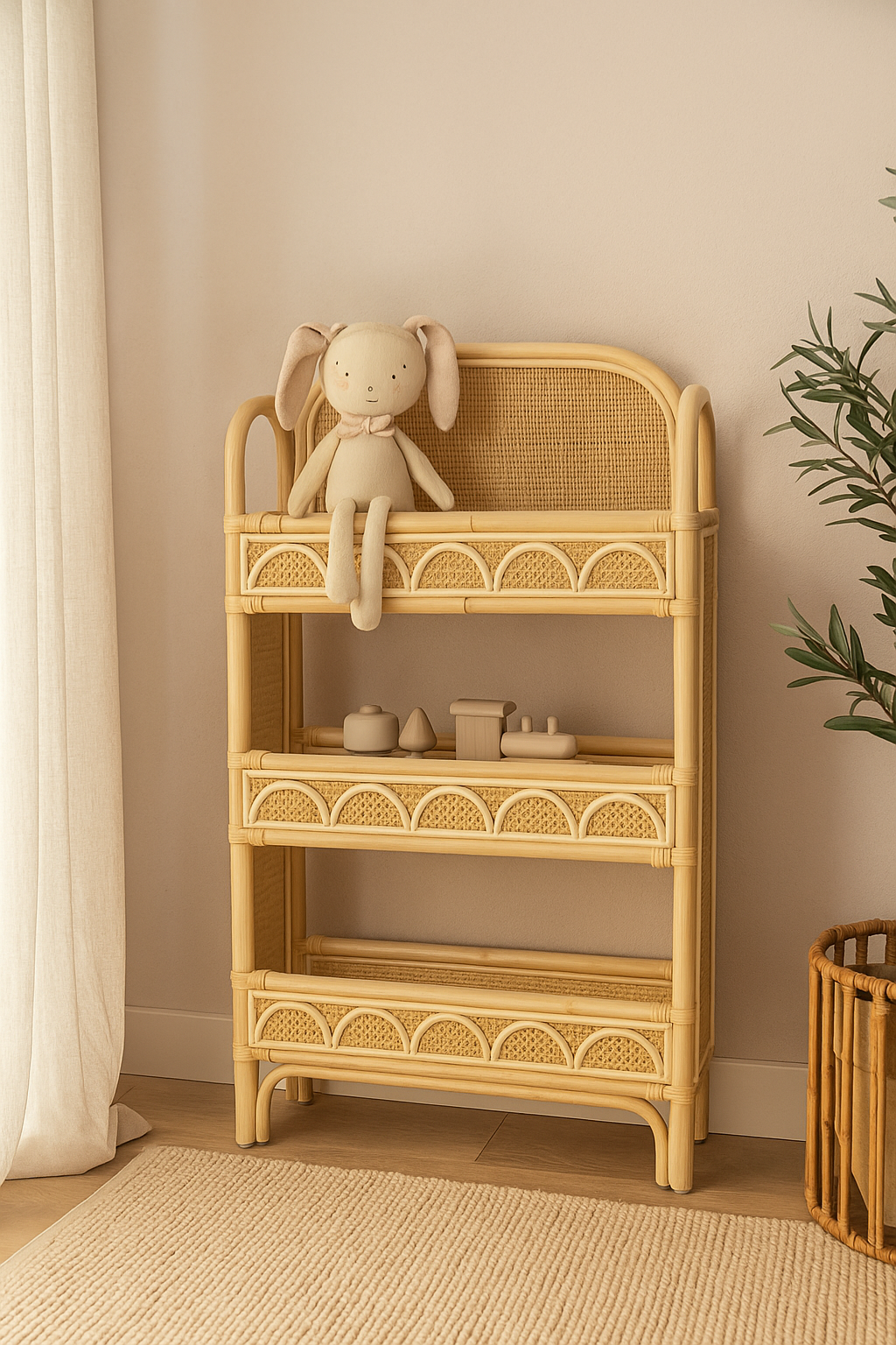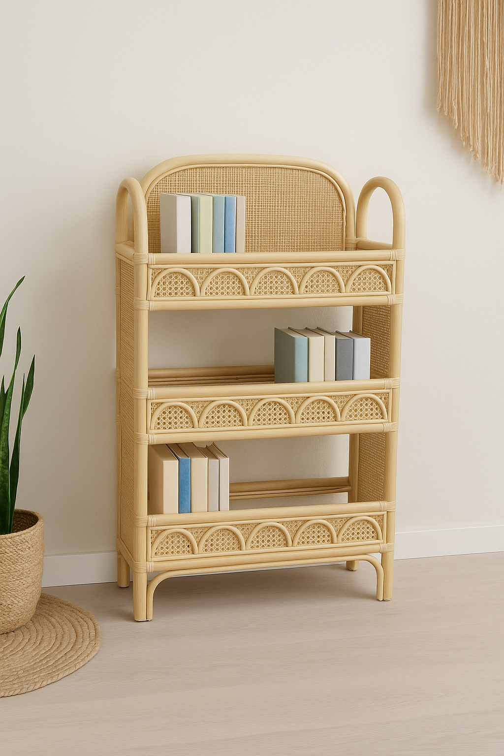Dit handgemaakte rotan boekenrekje is de perfecte aanvulling voor elke kinderkamer of speelhoek. Dankzij het speelse design met gebogen lijnen en verfijnd vlechtwerk is het niet alleen functioneel, maar ook een echte blikvanger.