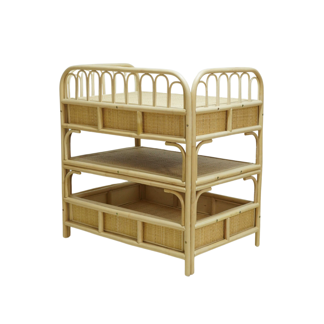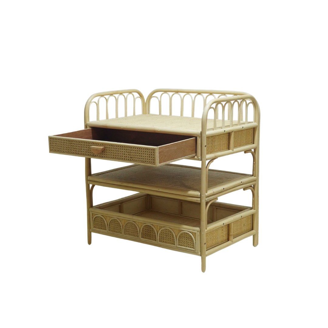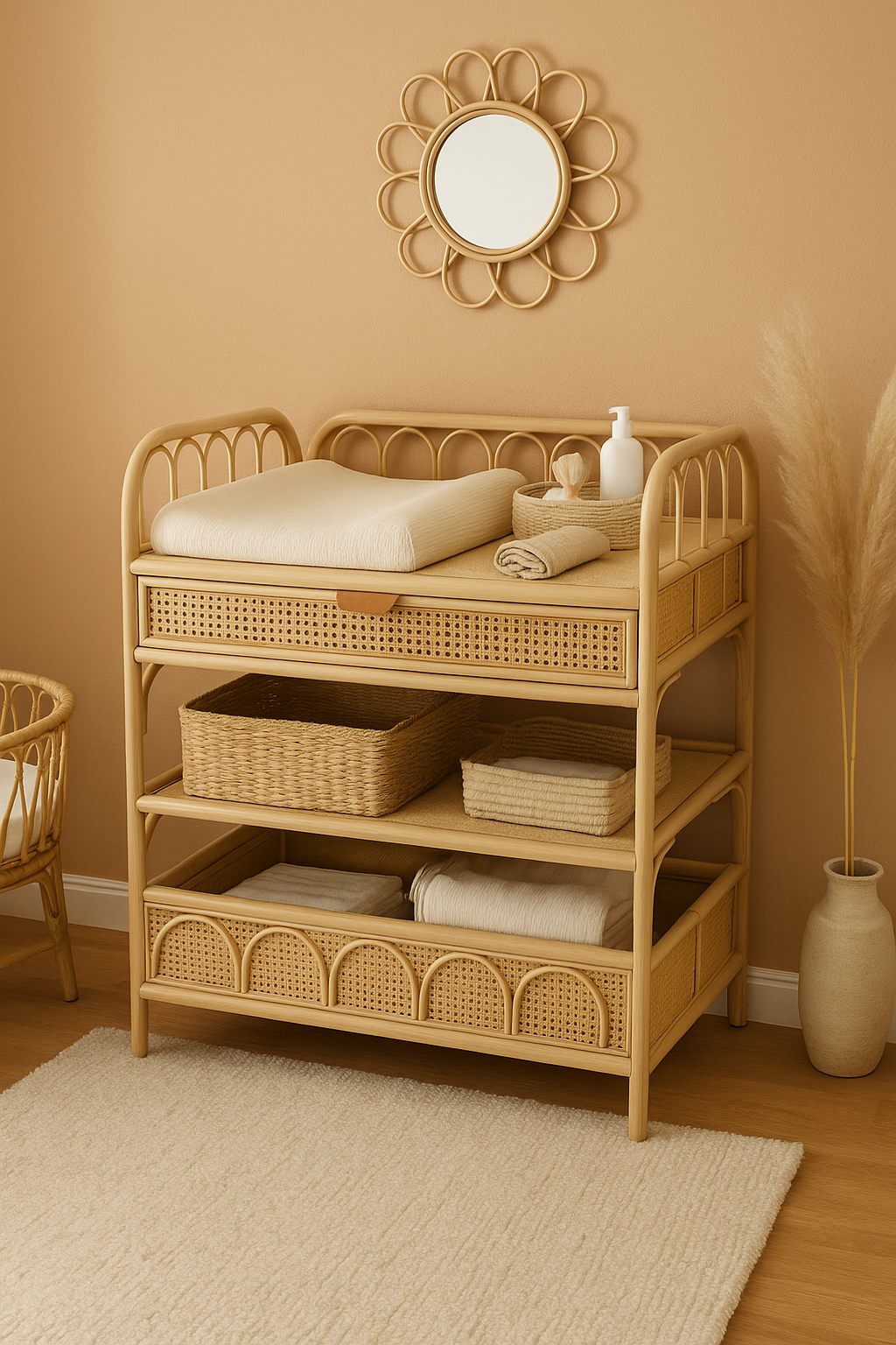 Deze prachtige rotan verzorgingstafel combineert functionaliteit met een warme, boho uitstraling. Met haar speelse boogdetails en natuurlijke afwerking is ze een echte eyecatcher in elke babykamer.