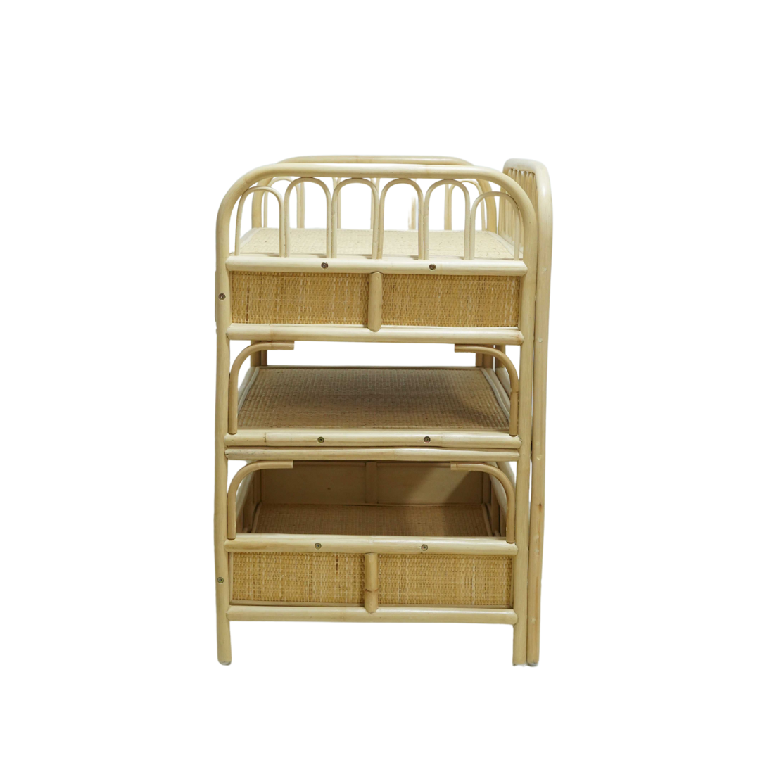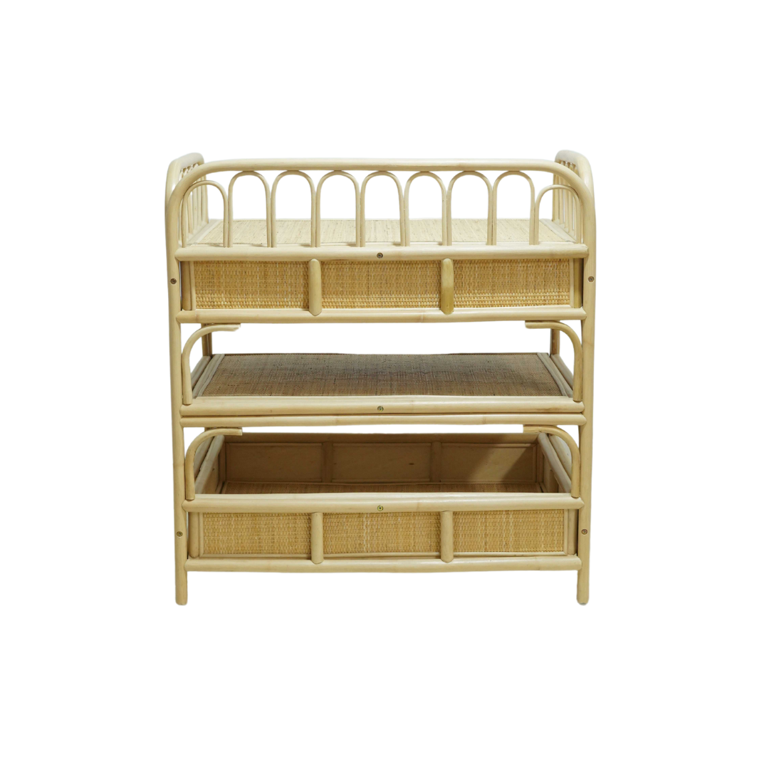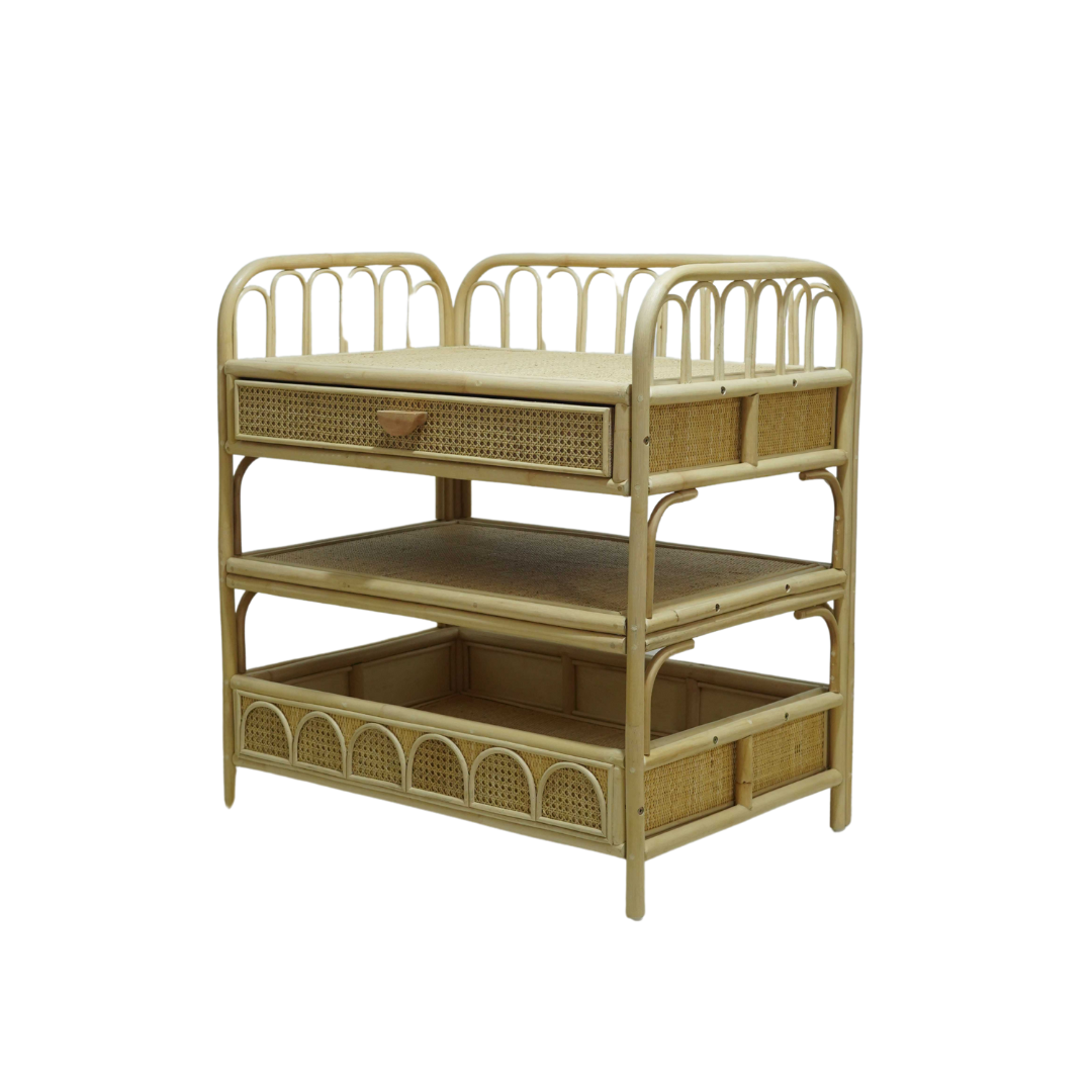 Deze prachtige rotan verzorgingstafel combineert functionaliteit met een warme, boho uitstraling. Met haar speelse boogdetails en natuurlijke afwerking is ze een echte eyecatcher in elke babykamer.