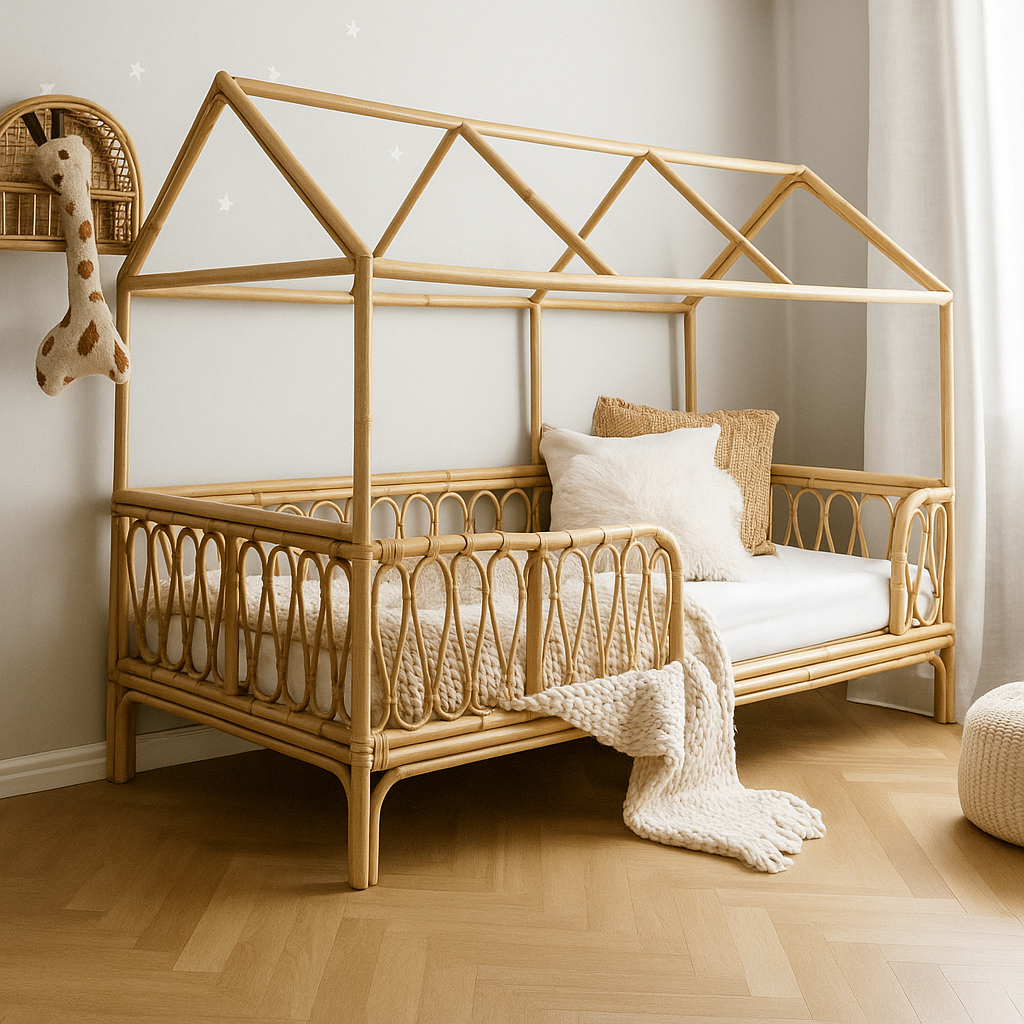 Dit betoverende bedhuisje is de perfecte combinatie van speels design en natuurlijke charme. Het lichte rotanframe met huisstructuur brengt warmte in de kinderkamer én stimuleert de verbeelding van je kleintje. Ideaal als knus slaapplaatsje, maar net zo leuk om overdag in te spelen of tot rust te komen.