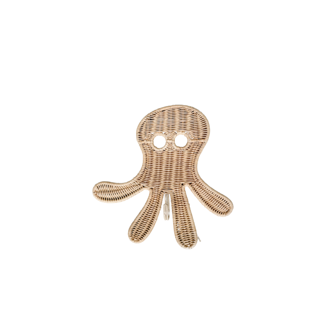 Oswald de Octopus wandhaak, verkrijgbaar in 2 maten, handgemaakt van hoogwaardige rotan, combineert op speelse wijze een onder water thema met de natuurlijke charme van handgeweven materialen. Het design toont een gedetailleerde, sierlijke octopusvorm.