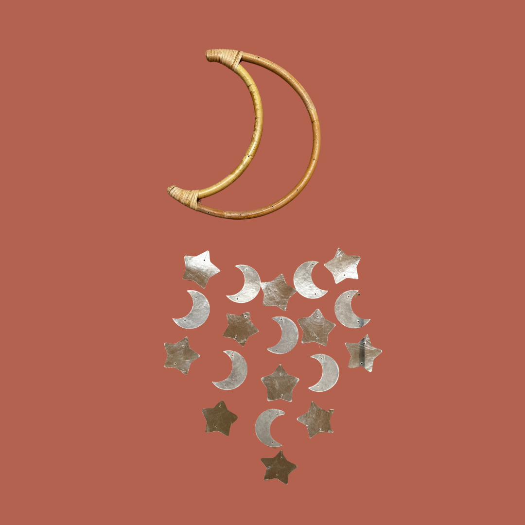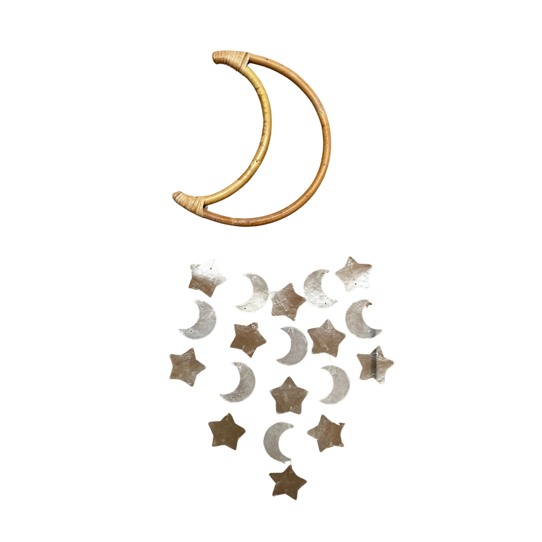 De Rotan Maan Mobile staat ontzettend leuk boven de wieg of het ledikant, maar kan ook aan het plafond gehangen worden. Onder de rotan maan hangen gouden schelpen in de vormen van sterren en maantjes.