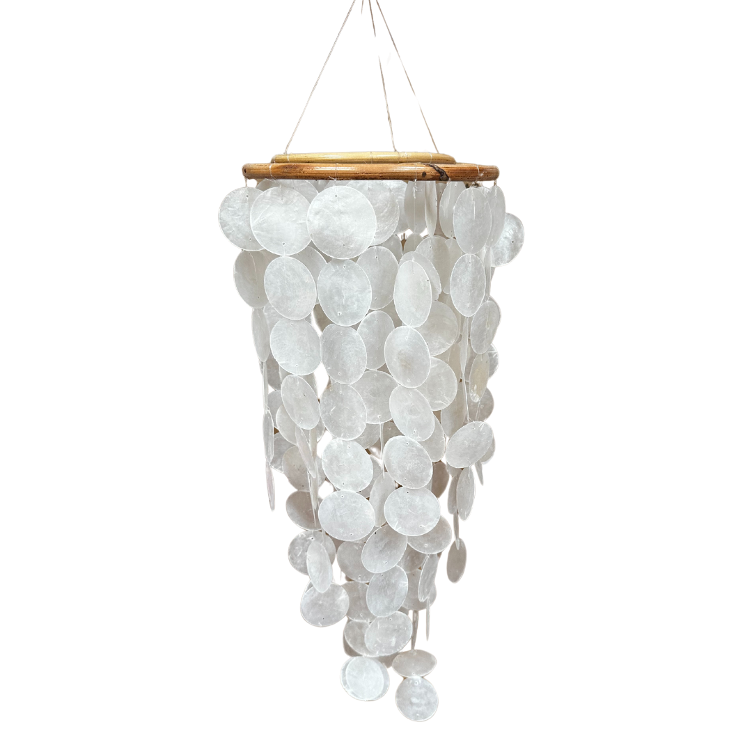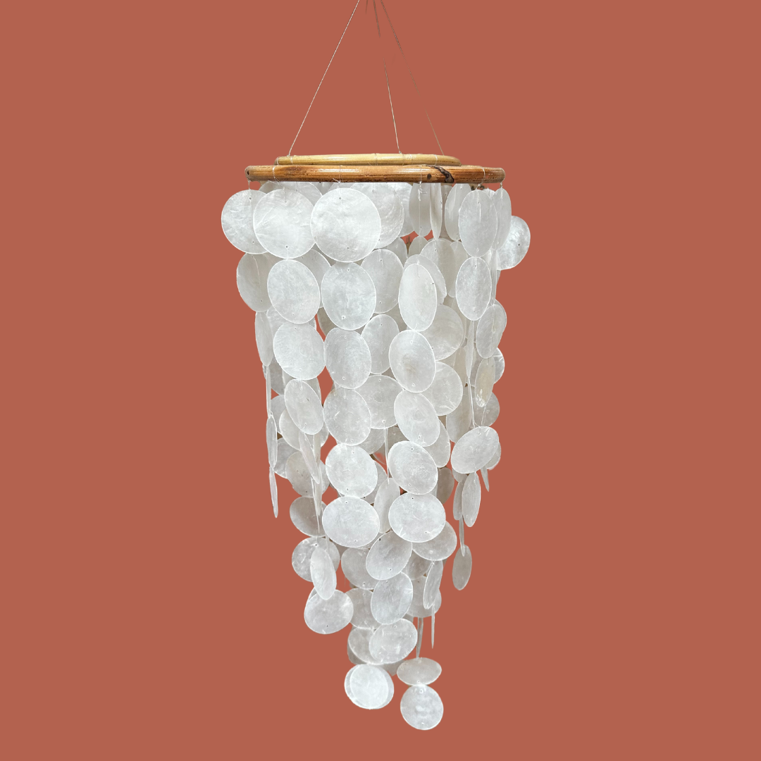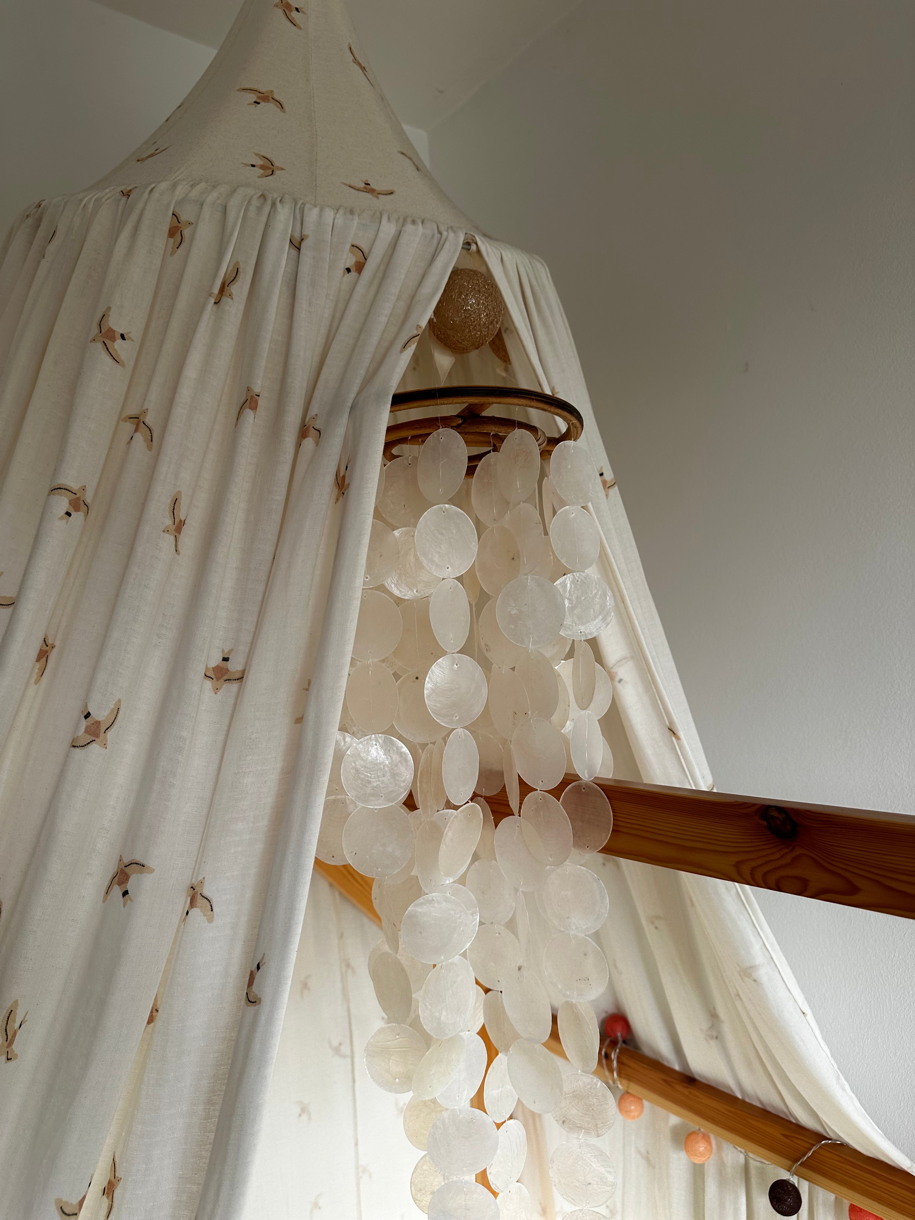 De Rotan Windgong Sifra staat ontzettend leuk boven de wieg of het ledikant, maar kan ook aan het plafond gehangen worden. Onder het ronde rotan stuk hangen schelpen in de vormen van ronde maantjes.