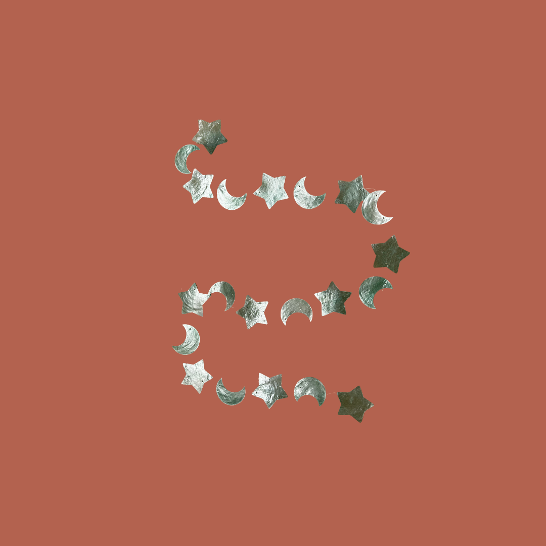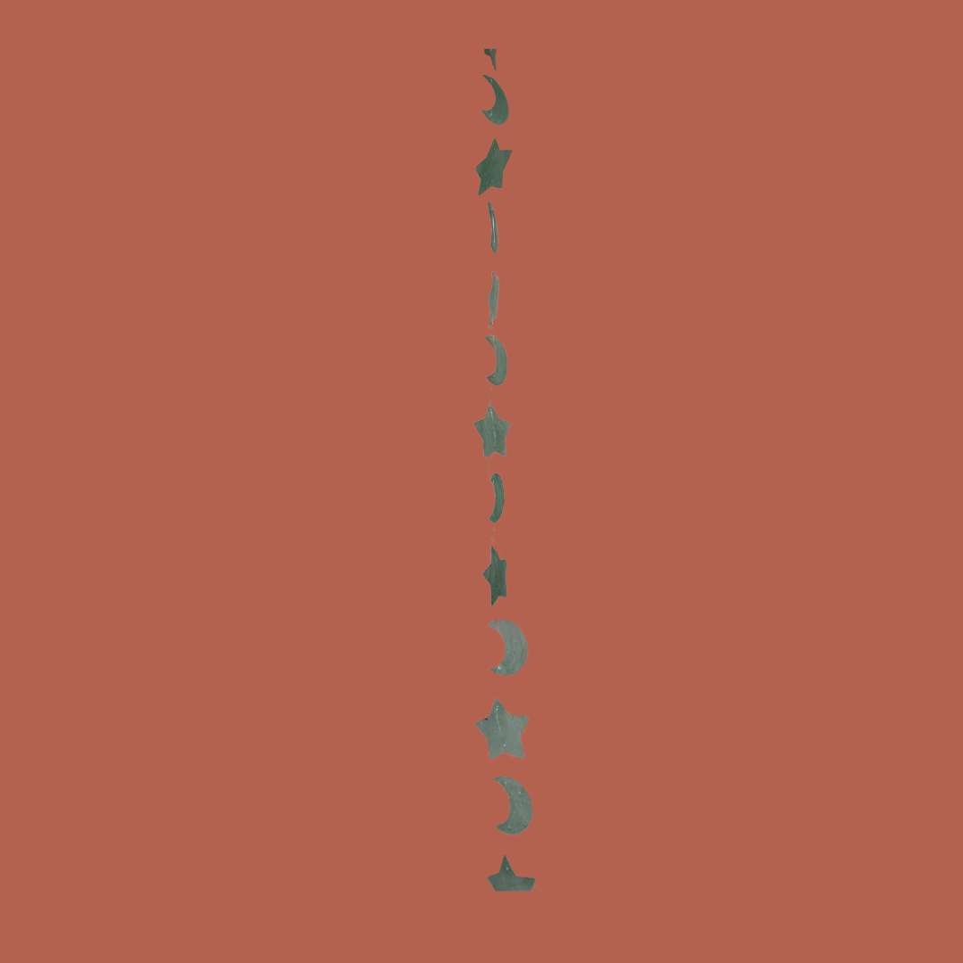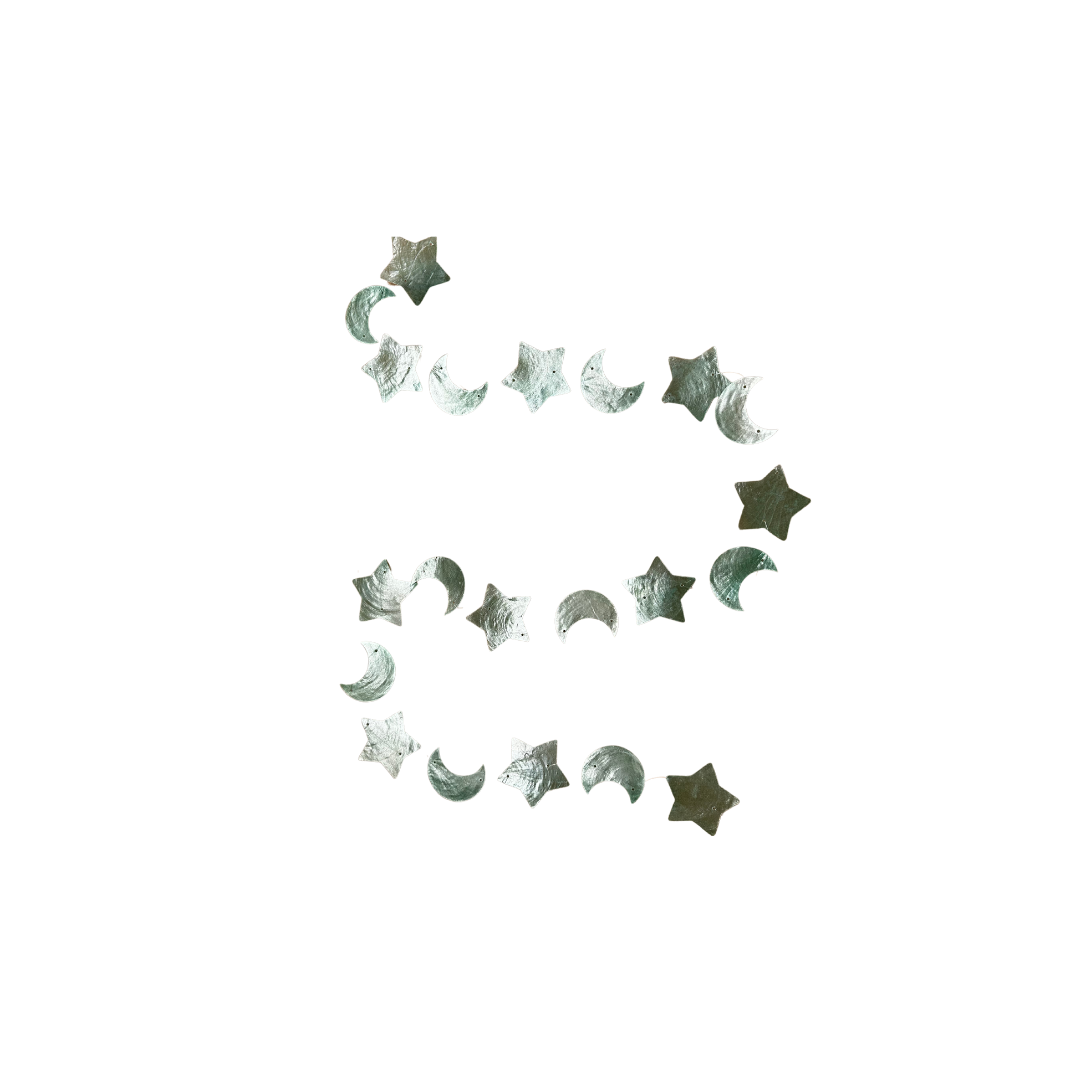 Een slinger gemaakt van aqua schelpen in de vormen van sterren en maantjes is een decoratief object dat bestaat uit een reeks schelpen die zijn uitgesneden in de vormen van sterren en halve manen. Deze schelpen hebben een prachtige aqua-kleur, die doet denken aan de heldere tinten van de oceaan. De slinger kan worden opgehangen aan muren, plafonds of buitenruimtes om een rustgevende en maritieme sfeer te creëren. De natuurlijke schoonheid en unieke vormen van de schelpen maken het een charmante toevoeging aan elk interieur of tuin, perfect voor het toevoegen van een vleugje zee-inspiratie aan je omgeving.
